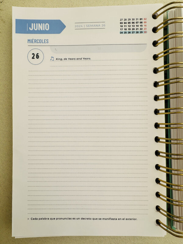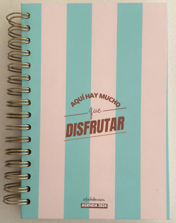 Agenda estilo Office. Tamaño media carta. Un nuevo diseño con organización diaria, va de enero a diciembre de 2024. Esta agenda contiene: ·368 páginas. Frases diarias motivacionales ·Horarios y calendarios de 2024 y 2025 ·Recomendaciones de canciones cada semana ·Páginas para anotar contactos ·Tablas de ahorro ·Blocs de notas· Actividades mensuales supermotivadoras.